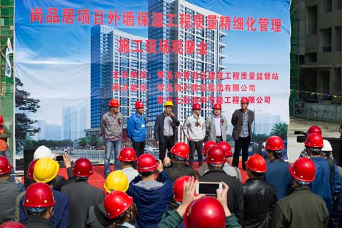 觀摩會(huì)當(dāng)天,集團(tuán)副總裁馬志驍、七分公司總經(jīng)理朱超等陪同黃島區(qū)質(zhì)監(jiān)站領(lǐng)導(dǎo)進(jìn)行了現(xiàn)場(chǎng)觀摩,上午9:00黃島區(qū)質(zhì)監(jiān)站領(lǐng)導(dǎo)主持了現(xiàn)場(chǎng)觀摩會(huì),對(duì)照實(shí)體樣板詳細(xì)講解保溫工程各工序質(zhì)量保證要點(diǎn)。主要就工程實(shí)體保溫工程界面劑噴涂、玻纖網(wǎng)粘貼、加強(qiáng)層粘貼、窗洞口巖棉套割、錨栓固定等施工工藝進(jìn)行了講解并宣布現(xiàn)場(chǎng)觀摩開(kāi)始。黃島區(qū)各與會(huì)單位人員現(xiàn)場(chǎng)觀摩了實(shí)體工序樣板,各單位間相互切磋工藝做法,交流標(biāo)準(zhǔn)化管理經(jīng)驗(yàn)。上午11:00觀摩人員陸續(xù)離開(kāi)施工現(xiàn)場(chǎng),現(xiàn)場(chǎng)觀摩會(huì)圓滿(mǎn)結(jié)束。